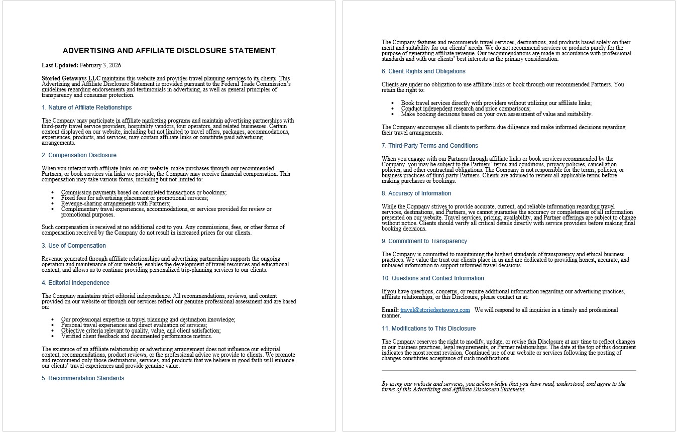 Storied Getaways LLC | CA SOT #2167514‑70 © Storied Getaways LLC. All rights reserved.| Our Terms & Conditions and Payment Policies can be found here. All content on this site is copyrighted by Storied Getaways LLC, and may not be reproduced, in whole or in part, without our express permission. Opinions expressed here are the author's alone, not those of advertisers or affiliated companies. Content may not be reproduced without express written permission. Opinions expressed are solely those of the author and do not represent advertisers or affiliated companies. Product claims or representations should be verified with the manufacturer or service provider. Some travel packages or offers on this site may be from companies that provide compensation to Storied Getaways LLC, which may influence how products appear. Please review our Advertising and Disclosure Statement for details. Some images are provided by travel suppliers. If you believe an image has been used in error, please contact us.